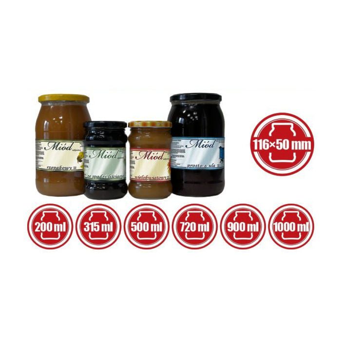 Paczka dużych etykiet na miód – pasują idealnie na średnie słoiki od 400ml wzwyż, lecz wygląda równie dobrze na słoikach 900ml.