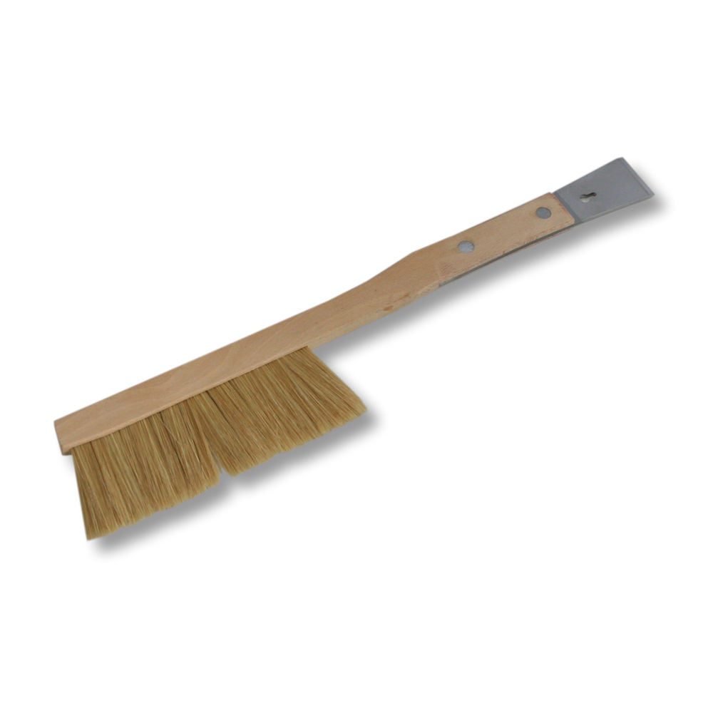 Płaska miotełka pasieczna, zmiotka pszczelarska z naturalnego włosia oprawiona w drewniany uchwyt z trzonkiem.