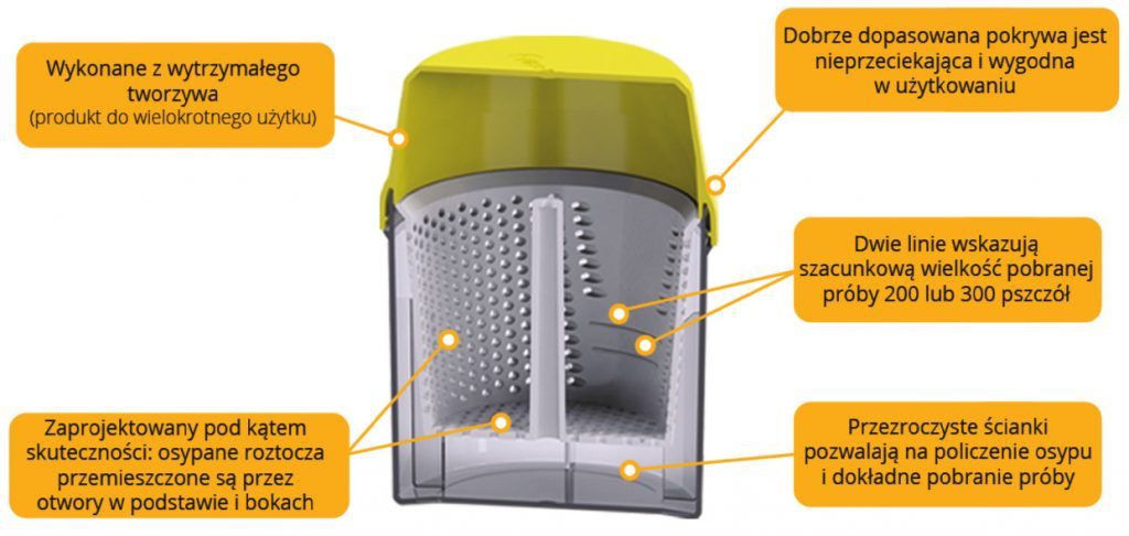 Specjalny kubek z sitkiem do przeprowadzania szybkiego badania pozwalającego sprawdzić porażenie warrozą co pozwala nam na podjęcie odpowiednich kroków i zastosowanie odpowiedniego leczenia pszczół.